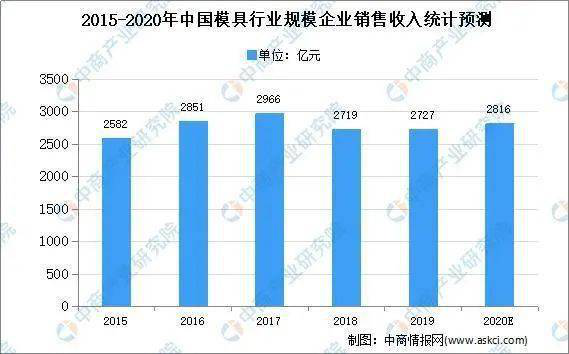 模具作为工业配套,其发展水平受汽车、电子、航空航天、军工、医疗、建材等下游行业发展的影响。数据显示,2019年我国模具行业规模以上企业销售收入达2727亿元,中商产业研究院预测, 2020年我国模具行业规模以上企业销售收入将达2816亿元。