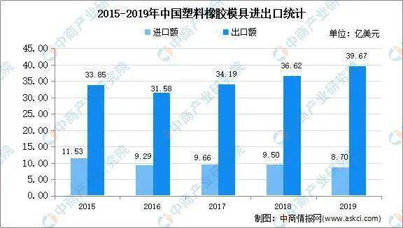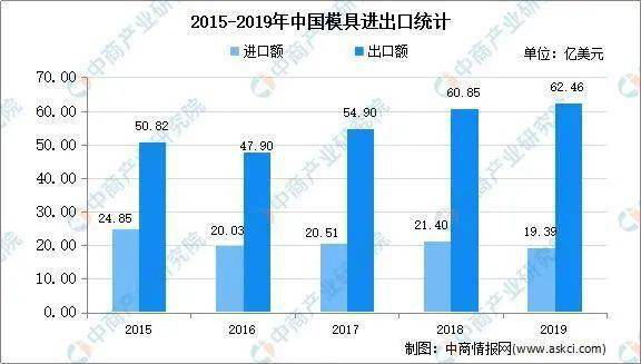 近年来,我国模具行业通过技术引进、消化吸收和再创新,实现了制造工艺快速提升,模具企业的专业化生产能力大幅增强,现代模具工业体系基本形成,行业得到了飞跃式发展。模具产品的制造技术达到或接近国际水平,质量更加可靠,国际竞争力显著增强, 我国模具在国际采购格局中占据越来越重要的地位。数据显示, 2019年我国模具出口金额达到62.46亿美元,2019年我国模具进口金额为19.39亿美元,同比下降9.37%。
